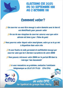 ELECTIONS PRO CSE DIF : VOTE ELECTRONIQUE 24/09/202523/09/2025 Les Élections Professionnelles de Darty Ile de France auront lieu du mardi 30 septembre au jeudi 2 octobre 2025. Partager : Cliquer pour partager sur X(ouvre dans une nouvelle fenêtre) X Cliquez pour partager sur Facebook(ouvre dans une nouvelle fenêtre) Facebook Sur le même thème